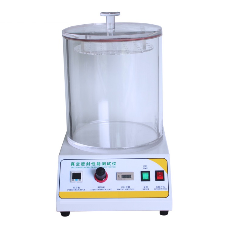 測試原理:通過對真空室抽真空,使浸在水中的試樣產生內外壓差,觀測試樣內氣體外逸情況,以此判定試樣的密封性能;通過對真空室抽真空,使試樣產生內外壓差,觀測試樣膨脹及釋放真空后試樣形狀恢復情況,以此判定試樣的密封性能。